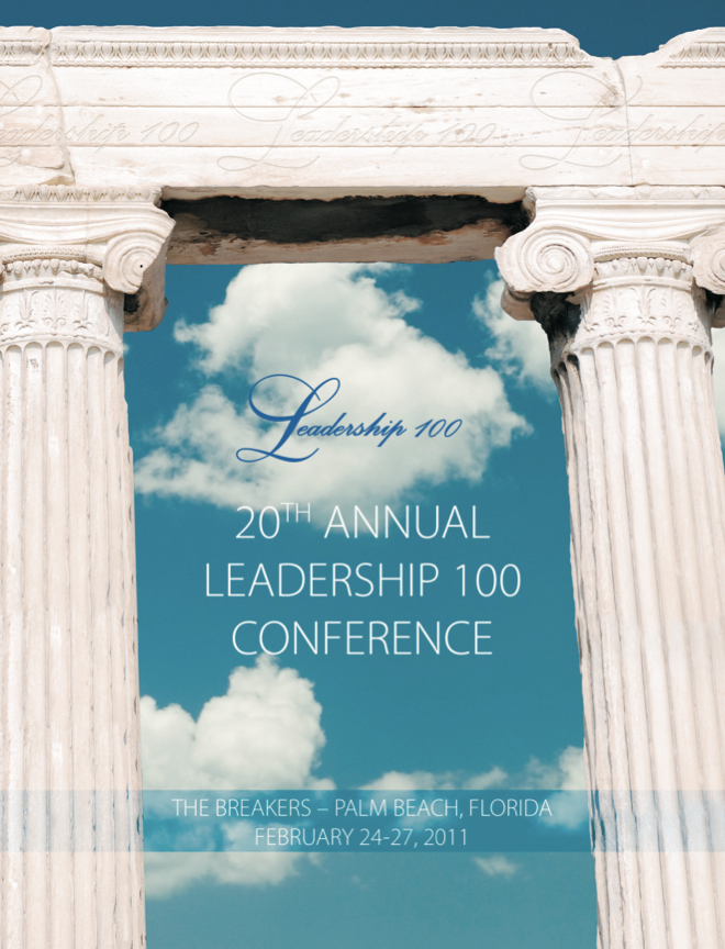 20th Annual Leadership 100 Conference Thursday, February 3, 2011 12:00 PM Sunday, February 6, 2011 7:00 PM Palm Beach 2700 North Ocean Drive West Palm Beach, FL, 33404 United States (map) Google Calendar ICS View Photo Highlights 20th Leadership 100 Conference, Palm Beach FL, 2011